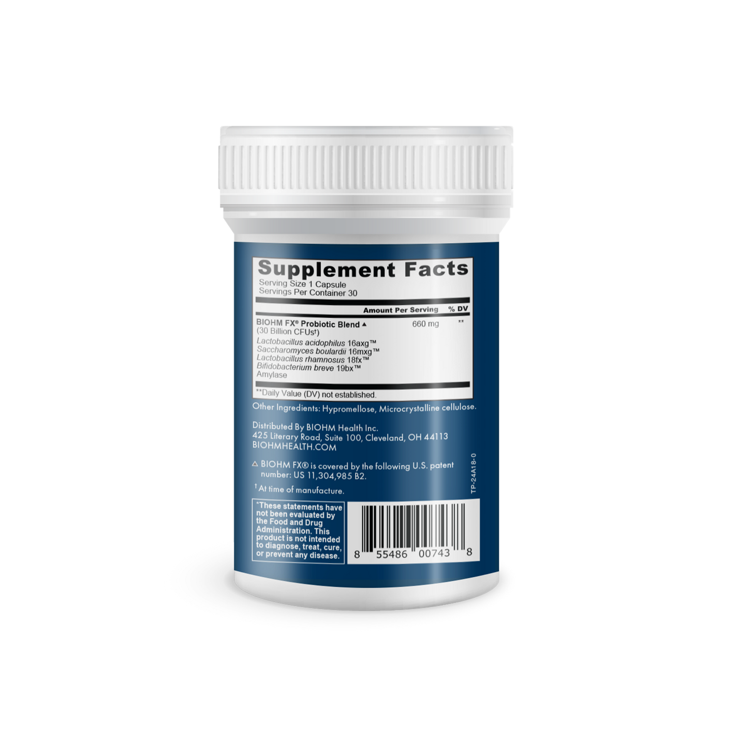 Servings Per Container: 30Amount per serving % Daily ValueBIOHM FX® Probiotic Blend ▲ 660mg **(30 Billion CFUs†)Lactobacillus acidophilus 16axg ™Saccharomyces boulardii 16mxg ™Lactobacillus rhamnosus 18fx ™Bifidobacterium breve 19bx ™Amylase**Daily Value (DV) not established.