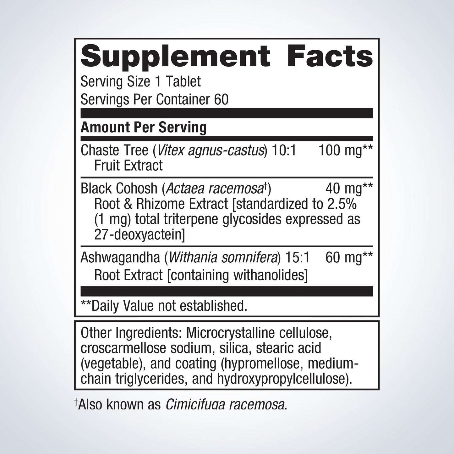 Servings Per Container: 60Amount per serving % Daily ValueChasteberry (Vitex agnus-castus) 10:1 Fruit Extract 100 mg *Black Cohosh (Actaea racemosa†) Root & Rhizome Extract [standardized to 2.5% (1mg) total triterpene glycosides expressed as 27-deoxyactein] 40 mg *Ashwagandha (Withania somnifera) 15:1 Root Extract [containing withanolides] 60 mg *Ingredients: Microcrystalline cellulose, croscarmellose sodium, silica, stearic acid (vegetable), and coating (hypromellose, medium-chain triglycerides, and hydroxypropylcellulose).