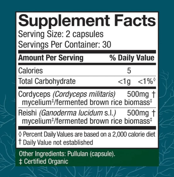 Servings Per Container: 30Calories 5Amount per serving % Daily ValueTotal Carbohydrate <1g <1%♢Cordyceps (Cordyceps militaris) mycelium‡ /fermented brown rice biomass‡ 500mg †Reishi (Ganoderma lucidum s.I.) 500mg - mycelium‡ /fermented brown rice biomass‡ 500mg †♢ Percent Daily Values are based on a 2.000 calorie diet