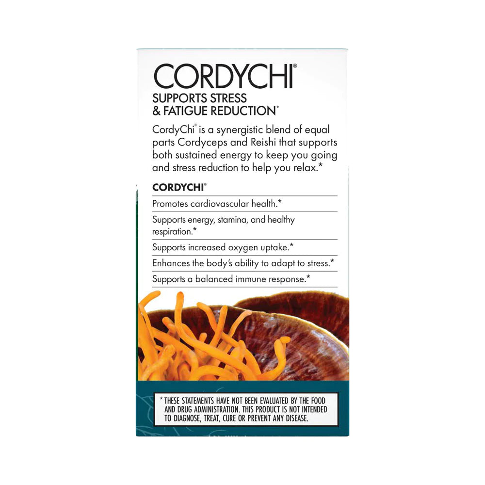 60 ct. A uniquely balanced blend of Cordyceps and Reishi, CordyChi brings the benefit of supporting energy and oxygen uptake with cellular nutrients. Adults with activelifestyles and those who seek balance in a stressful world will breathe easy with CordyChi.