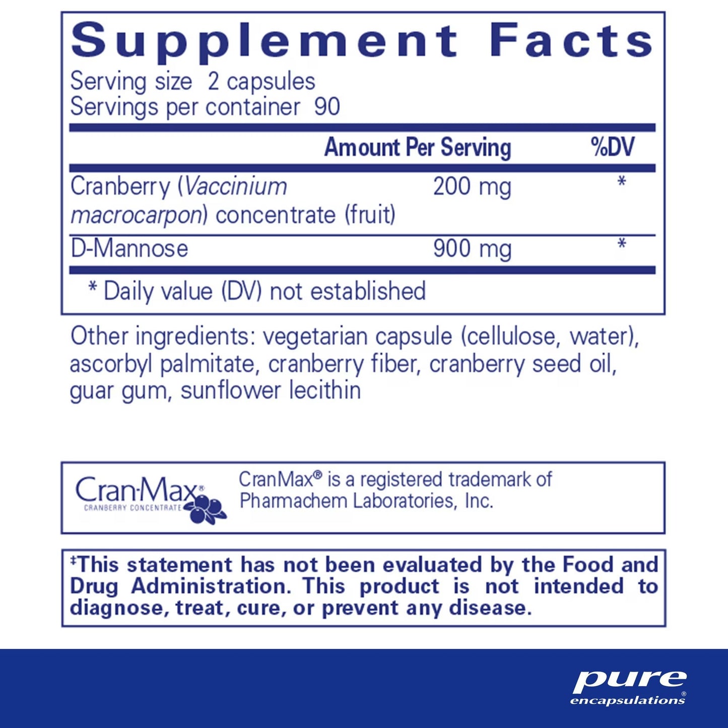 Servings Per Container: 90Amount per serving % Daily ValueCranberry (Vaccinium macrocarpon) concentrate (fruit) 200mg *D-Mannose 900mg ** Daily value (DV) not established
