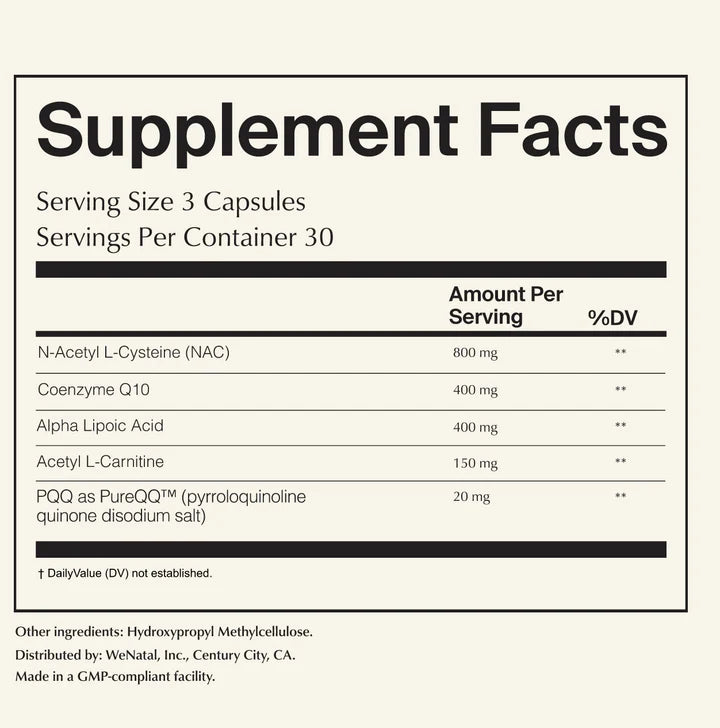 Servings Per Container: 30Amount per serving % Daily ValueN-Acetyl L-Cysteine (NAC) 800 mg **Coenzyme Q10 400 mg **Alpha Lipoic Acid 400 mg **Acetyl L-Carnitine 150 mg **PQQ as PureQQ™ (pyrroloquinoline quinone disodium salt) 20 mg **† DailyValue (DV) not established.Other ingredients: Hydroxypropyl Methylcellulose.