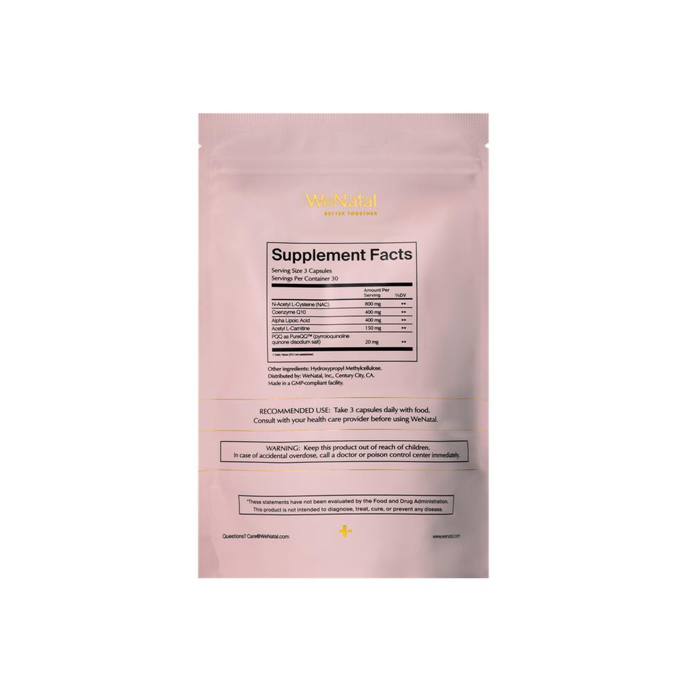 Egg Quality + complements WeNatal for Her prenatal by helping to reduce oxidative stress and boost cellular energy, helping to minimize chromosomal errors and improve optimal fertility outcomes.