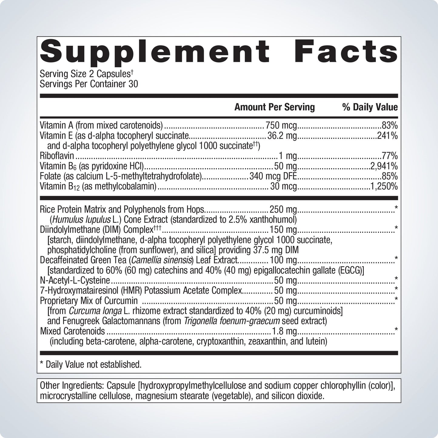 Servings Per Container: 30Amount per serving % Daily ValueVitamin A (from mixed carotenoids) 750 mcg 83%Vitamin E (as d-alpha tocopheryl succinate and d-alpha tocopheryl polyethylene glycol 1000 succinate††) 36.2 mg 241%Riboflavin 1 mg 77%Vitamin B6 (as pyridoxine HCl) 50 mg 2,941%Folate (as calcium L-5-methyltetrahydrofolate)††† 340 mcg DFE 85%Vitamin B12 (as methylcobalamin) 30 mcg 1,250%Rice Protein Matrix and Polyphenols from Hops (Humulus lupulus L.) Cone Extract (standardized to 2.5% xanthohumol) 250 mg *Diindolylmethane (DIM) Complex‡ [starch, diindolylmethane, d-alpha tocopheryl polyethylene glycol 1000 succinate, phosphatidylcholine (from sunflower), and silica)] providing 37.5 mg DIM 150 mg *Decaffeinated Green Tea (Camellia sinensis) Leaf Extract [standardized to 60% (60 mg) catechins and 40% (40 mg) epigallocatechin gallate (EGCG)] 100 mg *N-Acetyl-L-Cysteine 50 mg *7-Hydroxymatairesinol (HMR) Potassium Acetate Complex 50 mg *Proprietary Mix of Curcumin [from Curcuma longa L. rhizome extract standardized to 40% (20 mg) curcuminoids] and Fenugreek Galactomannans (from Trigonella foenum-graecum seed extract) 50 mg *Mixed Carotenoids (including beta-carotene, alpha-carotene, cryptoxanthin, zeaxanthin, and lutein) 1.8 mg *Other Ingredients: