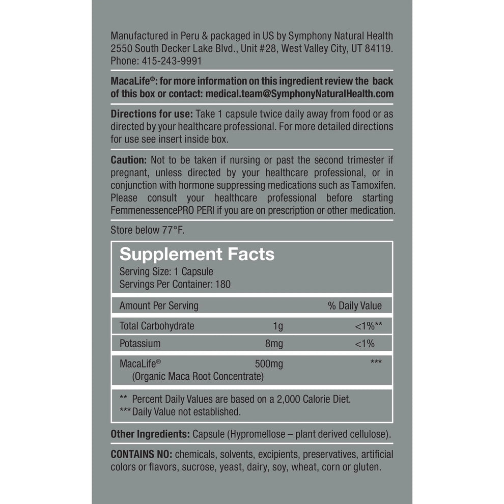 MacaLife®: for more information on this ingredient review the back of this box or contact: medical.team@SymphonyNatural Health.com Directions for use: Take 1 capsule twice daily away from food or as directed by your healthcare professional. For more detailed directions for use see insert inside box.
