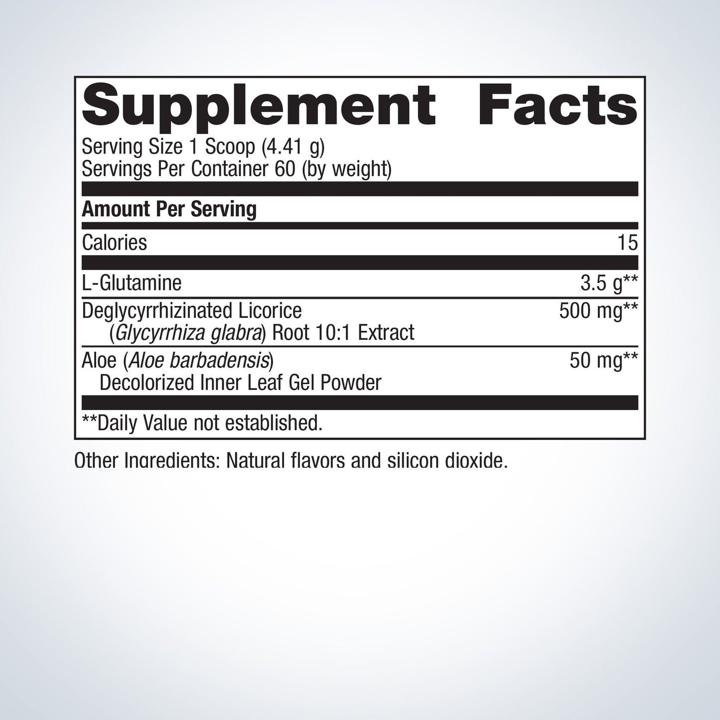 Servings Per Container: 60Calories 15Amount per serving % Daily ValueL-Glutamine 3.5 g *Deglycyrrhizinized Licorice (Glycyrrhiza glabra) Root 10:1 Extract 500 mg *Aloe (Aloe barbadensis) Decolorized Inner Leaf Gel Powder 50 mg *Other Ingredients:
