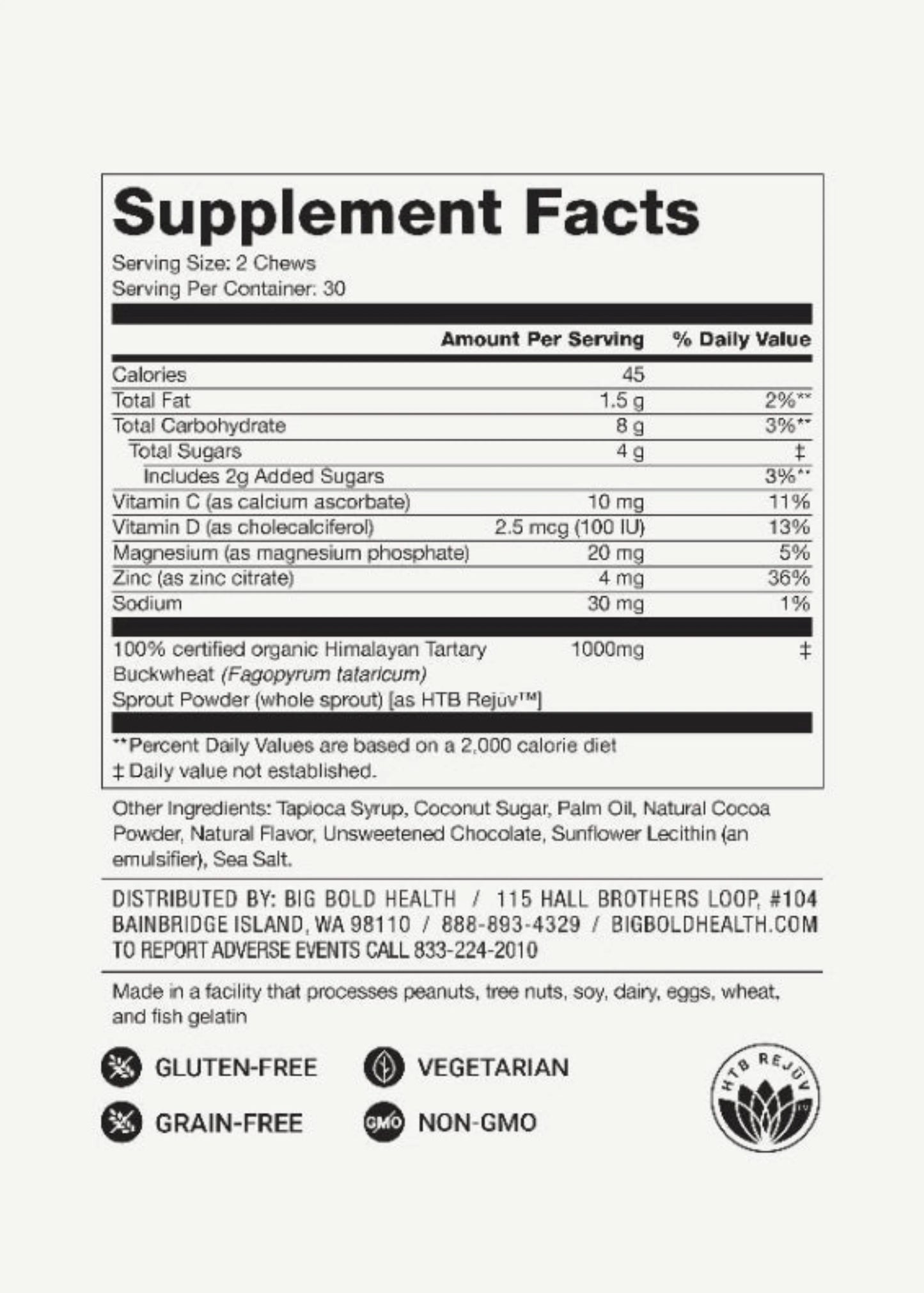 Servings Per Container: 30Calories 45Amount per serving % Daily ValueTotal Fat 1.5 g 2%Total Carbohydrate 8g 3%Total Sugars 4g tIncludes 2g Added Sugars 3%Vitamin C (as calcium ascorbate) 10 mg 11%Vitamin D us cholecalciferol 2.5 mcg (100 UMagnesium las magnesium phosphatel 20 mgZinc (as zinc citrate) 4 mg 36%Sodium 30 mg 1%1 00% certified organic Himalayan Tartary, Buckwheat (Fagopyrum tataricum), Sprout Powder (whole sprout) [as HTB Rejuv) 1000mg t"Percent Daily Values are based on a 2.000 calorie diet