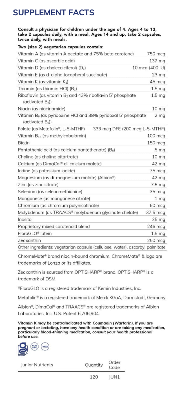 Servings Per Container: 60Amount per serving % Daily ValueVitamin A (as vitamin A acetate and 75% beta carotene) 750mcg *Vitamin C (as ascorbic acid) 137mg *Vitamin D (as cholecalciferol) (D3) 10mcg(400IU) *Vitamin E (as d-alpha tocopherol succinate) 23mg *Vitamin K (as vitamin K1) 45mcg *Thiamin (as thiamin HCI) (B1) 1.5mcg *Riboflavin (as vitamin B, and 43% riboflavin 5' phosphate (activated B)) 1.5mg *Niacin (as niacinamide) 10mg *Vitamin Bs (as pyridoxine HI and 38% pyridoxal 5' phosphate(activated B6)) 2mg *Folate (as Metafolin®. L-5-MTHF) 333mcg DFE (200mcg L-5MTHF) *Vitamin Biz (as methylcobalamin) 100mcg *Biotin 150mcg *Pantothenic acid (as calcium pantothenate) (B5) 5mg *Choline (as choline bitartrate) 10mg *Calcium (as DimaCal® di-calcium malate) 42mg *lodine (as potassium iodide) 75mcg *Magnesium (as di-magnesium malate) (Albion) 42mg *Zinc (as zinc citrate) 7.5mg *Selenium (as selenomethionine) 35mcg *Manganese (as manganese citrate) 1mg *Chromium (as chromium polynicotinate) 60mcg *Molybdenum (as TRAACS® molybdenum glycinate chelate) 37.5mcg *Inositol 25mg *Proprietary mixed carotenoid blend 246mcg *FloraGLO® lutein 1.5mg *Zeaxanthin 250mcg *Other ingredients: vegetarian capsule (cellulose, water), ascorbyl palmitate