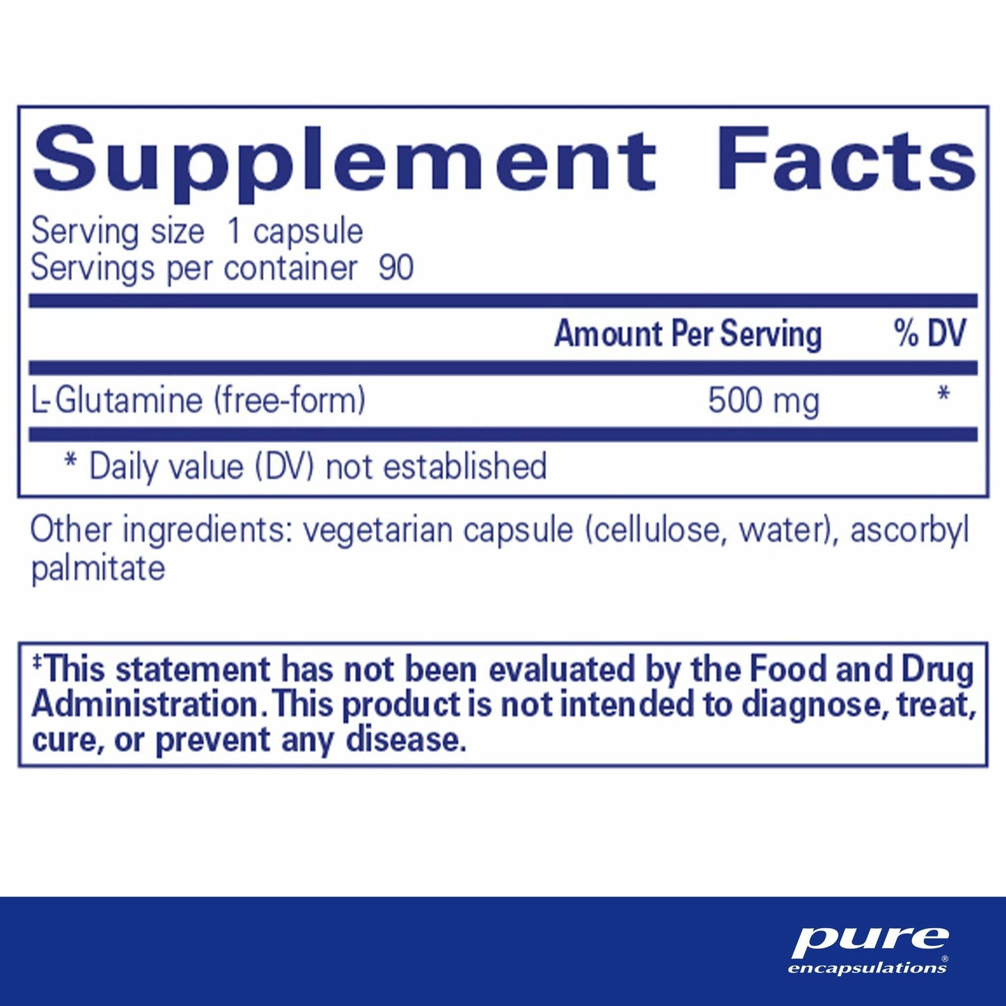 Servings Per Container: 90Amount per serving % Daily ValueL-Glutamine (free-form) 500mg ** Daily value (DV) not established