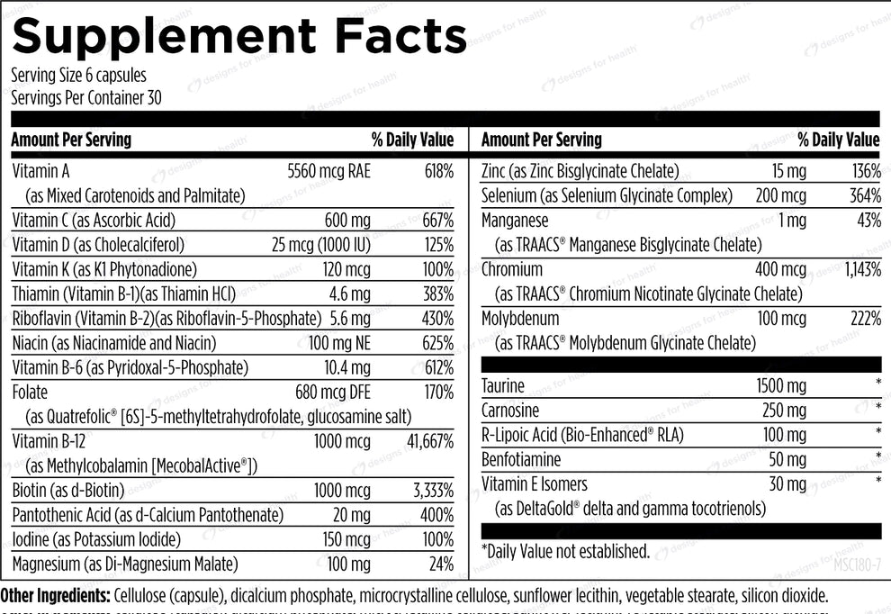 Servings Per Container: 30Amount per serving % Daily ValueVitamin A (as Mixed Carotenoids and Palmitate) 5560 mcg RAE 618%Vitamin C (as Ascorbic Acid) 600mg 667%Vitamin D (as Cholecalciferol) 25mcg 1000IU)Vitamin K (as K1 Phytonadione) 120mcg 100%Thiamin (Vitamin B-1)(as Thiamin HCI) 4.6mg 383%Riboflavin (Vitamin B-2)(as Riboflavin-5-Phosphate) 5.6mg 430%Niacin (as Niacinamide and Niacin) 100mg NE 625%Vitamin B-6 (as Pyridoxal-5-Phosphate) 10.4mg 612%Folate (as Quatrefolic® [65]-5-methyltetrahydrofolate, glucosamine salt) 680mcg DFE 170%Vitamin B-12 (as Methylcobalamin[MecobalActive®]) 1000 mcg 41,667%Biotin (as d-Biotin) 1000mcg 3333%Pantothenic Acid (as -Calcium Pantothenate) 20mg 400%lodine (as Potassium lodide) 150mcg 100%Magnesium (as Di-Magnesium Malate) 100mg 24%Zinc (as Zinc Bisglycinate Chelate) 15mg 136%Selenium (as Selenium Glycinate Complex) 200mcg 364%Manganese (as TRAACS® Manganese Bisglycinate Chelate) 1mg 43%Chromium (as TRAACS® Chromium Nicotinate Glycinate Chelate) 400 mcg 1,143%Molybdenum (as TRAACS® Molybdenum Glycinate Chelate) 100 mcg 222%Taurine 1500mg *Carnosine 250mg *R-Lipoic Acid (Bio-Enhanced® RLA) 100mg *Benfotiamine 50mg *Vitamin E Isomers (as DeltaGold® delta and gamma tocotrienols) 30mg *Other Ingredients: Cellulose (capsule), dicalcium phosphate, microcrystalline cellulose, sunflower lecithin, vegetable stearate, silicon dioxide.