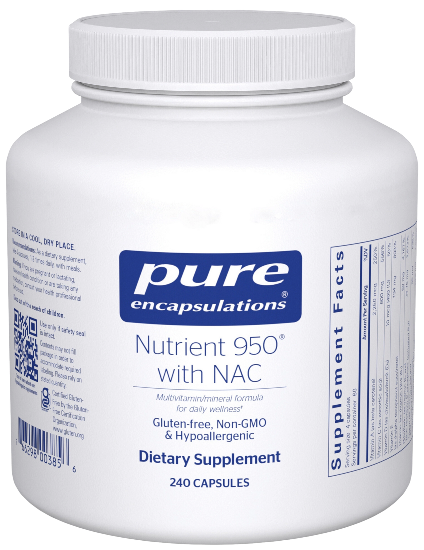 Nutrient 950® is a complete hypo-allergenic, high-nutrient, bioavailable multivitamin, multimineral and trace element supplement. It offers an advanced mineral delivery system, and the highly desirable coenzyme forms of B vitamins to promote optimal absorption of the nutrients.