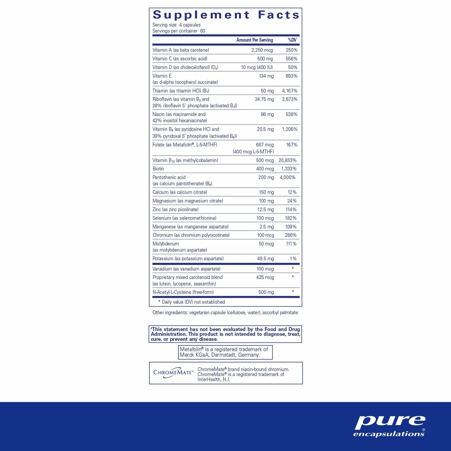 Servings Per Container: 60Amount per serving % Daily ValueVitamin A (as beta carotene) 2,250 mcg 250%Vitamin C (as ascorbic acid) 500 mg 556%Vitamin D (as cholecalciferol) (D3) 10 mcg (400 IU) 50%Vitamin E (as d-alpha tocopherol succinate) 134 mg 893%Thiamin (as thiamin HCI) (B1) 50 mg 4,167%Riboflavin (as vitamin B2 and 28% riboflavin 5' phosphate (activated B2)) 34.75 mg 2,673%Niacin (as niacinamide and 12% inositol hexaniacinate 86 mg 538%Vitamin B6 (as pyridoxine HCI and 39% pyridoxal 5' phosphate (activated B6)) 20.5 mg 1,206%Folate (as Metafolin®, L-5-MTHF) 667 mcg (400 mcg L-5-MTHF) 167%Vitamin B12 (as methylcobalamin) 500mcg 20,833%Biotin 400mcg 1333%Pantothenic acid (as calcium nantothenate B5) 200mg 4000%Calcium (as calcium citrate) 150 mg 12%Magnesium (as magnesium citrate) 100mg 24%Zinc (as zinc picolinate) 12.5 mcg 114%Selenium (as selenomethionine) 100 mcg 182%Manganese (as manganese aspartate) 2.5 mg 109%Chromium (as chromium polynicotinate) 100 mcg 286%Molybdenum (as molybdenum aspartate) 50 mcg 111%Potassium (as potassium aspartate) 49.5 mg 1%Vanadium (as vanadium aspartate) 100mcg *Proprietary mixed carotenoid blend (as lutein, lycopene, zeaxanthin) 425mcg *N-Acetyl-L-Cysteine(free-form) 500mg *Other ingredients: vegetarian capsule (cellulose, water), ascorbyl palmitate