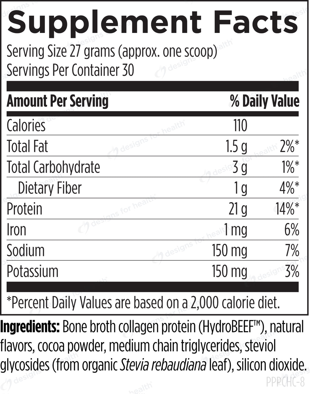 Servings Per Container: 30Calories 100Amount per serving % Daily ValueTotal Fat 1.5g 2%Saturated Fat 0.5 3%Cholesterol less than 5 mg <2%Total Carbohydrate 3g 1%Dietary Fiber 1g 4%Protein 21g 14%Sodium 140mg 6%Potassium 150mg 3%Ingredients: Bone broth protein (as HydroBEEF™), natural