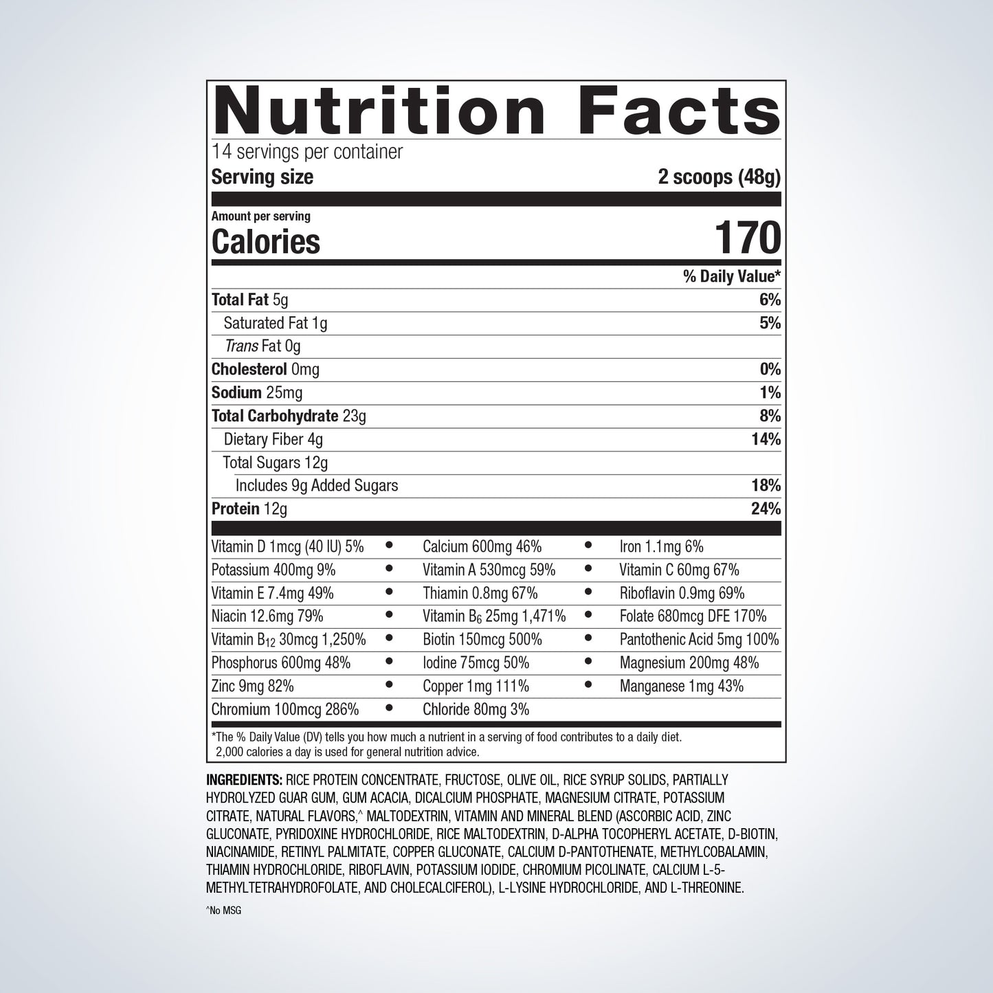 Rice protein concentrate, fructose, olive oil, rice syrup solids, partially hydrolyzed guar gum, gum acacia, dicalcium phosphate, magnesium citrate, potassium citrate, natural flavors,^ maltodextrin, vitamin and mineral blend (ascorbic acid, zinc gluconate, pyridoxine hydrochloride, rice maltodextrin, d-alpha tocopheryl acetate, d-biotin, niacinamide, retinyl palmitate, copper gluconate, calcium d-pantothenate, methylcobalamin, thiamin hydrochloride, riboflavin, potassium iodide, chromium picolinate, calcium l-5 methyltetrahydrofolate,† and cholecalciferol), l-lysine hydrochlor