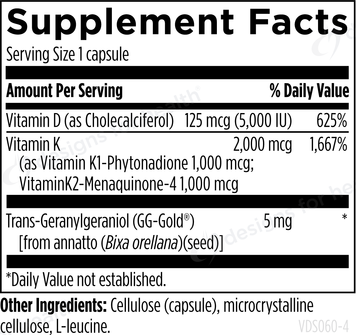 Servings Per Container: 60Amount per serving % Daily ValueVitamin D (as Cholecalciferol) 125 mcg (5000 IU) 625%Vitamin K 2,000 mcg 1.667%Vitamin K1-Phytonadione 1,000 mcg *Vitamin K2-Menaquinone-4 1,000 mcg *Trans-Geranylgeraniol(GG-Gold®) 5 mg *Other Ingredients: Cellulose (capsule), microcrystalline cellulose, L-leucine.