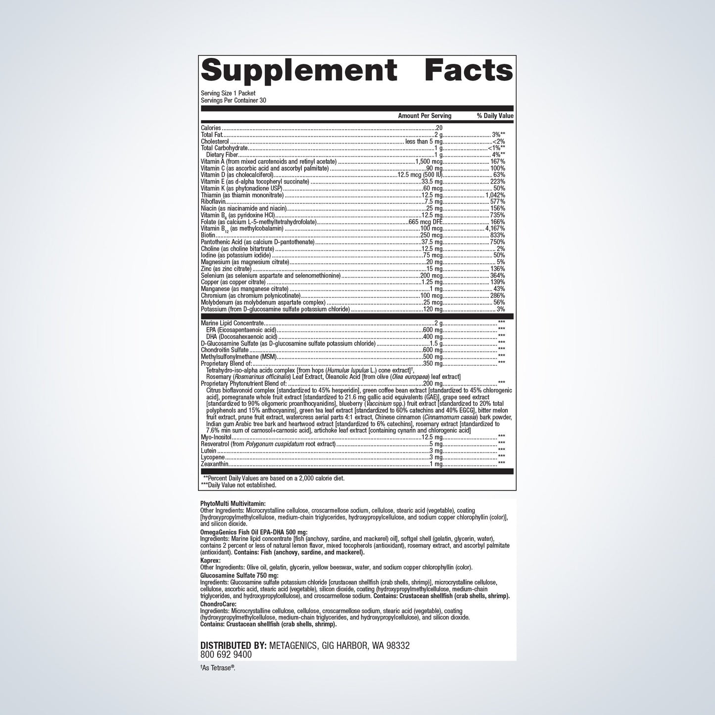 Servings Per Container: 30Calories 20Amount per serving % Daily ValueTotal Fat 2 g 3%**Cholesterol less than 5 mg <2%Total Carbohydrate 1 g <1%**Dietary Fiber 1 g 4%**Vitamin A (from mixed carotenoids and retinyl acetate) 1,500 mcg 167%Vitamin C (as ascorbic acid and ascorbyl palmitate) 90 mg 100%Vitamin D (as cholecalciferol) 500 IU 63%Vitamin E (as d-alpha tocopheryl succinate) 33.5 mg 223%Vitamin K (as phytonadione) 60 mcg 50%Thiamin (as thiamin mononitrate) 12.5 mg 1,042%Riboflavin 7.5 mg 577%Niacin (as niacinamide and niacin) 25 mg 156%Vitamin B6 (as pyridoxine HCl) 12.5 mg 735%Folate (as calcium L-5-methyltetrahydrofolate†) 665 mcg 166%Vitamin B12 (as methylcobalamin) 100 mcg 4,167%Biotin 250 mcg 883%Pantothenic Acid (as D-calcium pantothenate) 37.5 mg 750%Choline (as choline bitartrate) 12.5 mg 2%Iodine (as potassium iodide) 75 mcg 50%Magnesium (as magnesium citrate) 20 mg 5%Zinc (as zinc citrate) 15 mg 136%Selenium (as selenium aspartate and selenomethionine) 200 mcg 364%Copper (as copper citrate) 1.25 mg 139%Manganese (as manganese citrate) 1 mg 43%Chromium (as chromium polynicotinate) 100 mcg 286%Molybdenum (as molybdenum aspartate complex) 25 mcg 56%Potassium (from D-glucosamine sulfate potassium chloride) 120 mg 3%D-Glucosamine Sulfate (as D-glucosamine sulfate potassium chloride) 1.5 g ***Methylsulfonylmethane (MSM) 500 mg ***Chondroitin Sulfate 600 mg ***Inositol 12.5 mg ***Lycopene 3 mg ***Zeaxanthin 1 mg ***Lutein 3 mg ***Resveratrol (from Polygonum cuspidatum root extract) 5 mg ***Proprietary Blend of: Tetrahydro-iso-alpha acids complex [from hops (Humulus lupulus L.) cone extract]††, Rosemary (Rosmarinus officinalis) Leaf Extract, Oleanolic Acid [from olive (Olea europaea) leaf extract] 350 mg ***Proprietary Blend of:Citrus bioflavonoid complex [standardized to 45% hesperidin], green coffee bean extract [standardized to 45% chlorogenic acid], pomegranate whole fruit extract [standardized to 21.6 mg gallic acid equivalents (GAE)], grape seed extract [standardized to 90% polyphenols], blueberry (Vaccinium spp.) fruit extract [standardized to 20% total polyphenols and 15% anthocyanins], green tea leaf extract [standardized to 60% catechins and 40% EGCG], bitter melon fruit extract, prune skin extract [standardized to 50% polyphenols], watercress aerial parts 4:1 extract, Chinese cinnamon (Cinnamomum cassia) bark powder, Indian gum Arabic tree bark and heartwood extract [standardized to 6% catechins], rosemary extract [standardized to 7.6% min sum of carnosol+carnosic acid], artichoke leaf extract [containing cynarin and chlorogenic acid] 200 mg ***Marine Lipid Concentrate 2 g ***EPA (Eicosapentaenoic acid) 600 mg **DHA (Docosahexaenoic acid) 400 mg ***PhytoMulti
