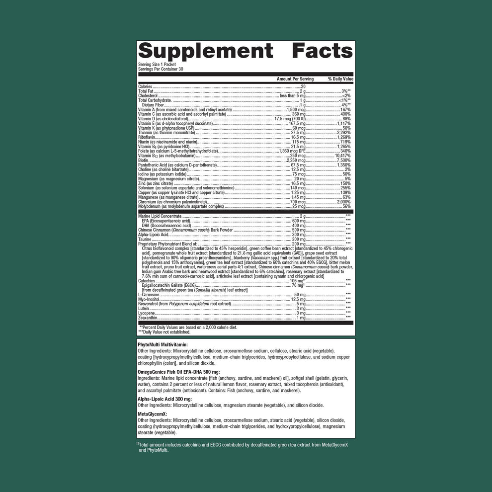 Servings Per Container: 30Calories 20Amount per serving % Daily ValueTotalFat 2g 3%Cholesterol less then 5mg <2%Total Carbohydrate 1g <1%*Dietary Fiber 1g 4%**Vitamin A (from mixed carotenoids and retinyl acetate) 1,500mcg 167%Vitamin C (as ascorbic acid and ascorbyl palmiate 360mg 400%Vitamin D (as cholecalciferol) 17.5mcg(700IU) 88%Vitamin E (as d-alpha tocopheryl succinate) 167.5mg 1,117%Vitamin K (as phytonadione USP) 60 mcg 50%Thiamin (as thiamin mononitrate) 27.5mg 2,292%Riboflavin 16.5mg 1,269%Niacin (as niacinamide and niacin) 115mg 719%Vitamin B6 (as pyridoxine HC) 21.5mg 1,265%Folate (as calcium L-5-methyltetrahydrofloate) 1,360mcg DFE 340%Vitamin B12 (as methylcobalamin) 250mcg 10,417%Biotin 2,250mcg 7,500%Pantothenic Acid (as calcium D-pantothenate) 67.5mg 1,350%Choline (as choline bitartrate) 12.5mg 50%lodine (as potassium iodide) 75mcg 50%Magnesium (as magnesium citrate 20mg 5%Zinc (as zinc citrate) 16.5mg 150%Selenium (as selenium aspartate and selenomethione) 140mcg 255%Copper (as copper lysinate HCI and copper citrate) 1.25mg 139%Manganese (as manganese citrate 1.45mg 63%Chromium (as chromium polynicotinate) 700mcg 2,000%Molybdenum (as molybdenum aspartate complex) 25mcg 56%Marine Lipid Concentrate 2g *EPA (Ecosapentaenoic acid) 600mg *DHA (Docosahexaenoic acid) 400mg *Chinese Cinnamon (Cinnamon cassia) Bark Powder 500mg *Alpha-Lipoic Acid 300mg *Taurine 300mg *Proprietary Phytonutrient Blend of:Citrus bioflavonoid complex (standardized to 45% hesperidin), green coffee bean extract (standardized to 45% chlorogenicacid) pomegranate whole fruit (standardized to 21.6 mg gallic acid equivalents (GAE), grape seed extract, ( standardized to 85% oligomeric proanthocyanidins), blueberry(Vaccinium spp.)fruit extract (standardized to20% total polyphenols and 155 anthocyanins), green tea leaf extract ( standardized to 60% catechins and 40% EGCG), bitter melon fruit extract prune skin( standardized to 50% polyphenols) water cress aerial parts 4:1 extract, Chineses cinnamon (Cinnamomum cassia) bark powder, Indian gum Arabic tree bark and heartwood extract ( standardized to 6% catechins), rsoemary extract (standardized to 7.6% min sum of carnosol+carnosix acis) arichoke leaf extract (containing cynarin andchlorogenic acid)Catechins 105 mg *Epigallocatechin Gallate (EGCG)[from decaffeinated green tea (Camellia sinensis) leaf extract 70mg *L-Carosine 50mg *Myo-Inositol 12.5mg *Resveratrol (from Polygonum cuspidatum root extract) 5mg *Lutein 3mg *Lycopene 3mg *Zeaxanthin 1mg *Other Ingredients: