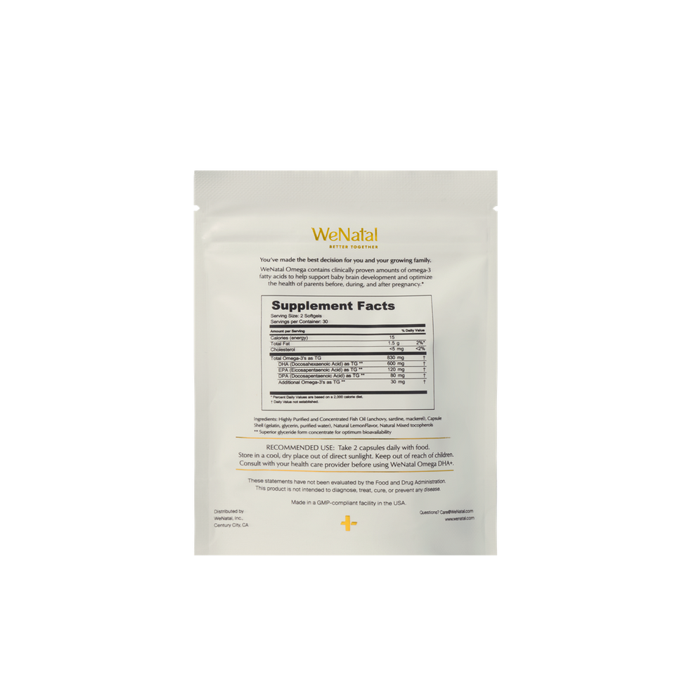 WeNatal Omega DHA+ contains clinically proven amounts of omega-3 fatty acids to help support baby brain development and optimize the health of both mom and dad before, during, and after pregnancy.