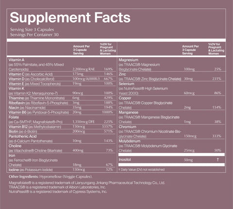 Servings Per Container: 30Amount per serving % Daily ValueVitamin A (as 55% Palmitate, and 45% Mixed Carotenoids) 2,200mcg RAE 169%Vitamin C (as Ascorbic Acid) 175mg 146%Vitamin D (as Cholecalciferol) 100mcg (4,0001U) 667%Vitamin E (as Mixed Tocopherols) 19mg 100%Vitamin K (as Vitamin K2: Menaguinone-7) 90mcg 100%Thiamine (as Thiamine Mononitrate) 6mg 429%Riboflavin (as Riboflavin-5-Phosphate) 3mg 188%Niacin (as Niacinamide) 35mg 194%Vitamin B6 (as Pvridoxal-5-Phosphate) 20mg 1000%Folate (as Ca-5MTHF; Magnafolate®-Pro) 1,350mcg DFE 225%Vitamin B12 (as Methvlcobalamin) 150mcg 5357%Biotin (as d-Biotin) 200mcg 571%Pantothenic Acid (as d-Calcium Pantothenate) 10mg 143%Choline (as Vitacholine® Choline Bitartrate 400mg 73%Iron (as Ferrochel® Iron Bisalvcinate Chelate) 18mg 67%lodine (as Potassium lodide) 150mcg 52%Magnesium (as TRAACS® Magnesium Bisglycinate Chelate) 100mg 25%Zinc (as TRAACS® Zinc Bisglycinate Chelate) 30mg 231%Selenium I (as NutraFeast® High Selenium Yeast 2000) 60mcg 86%Copper (as TRAACS® Copper Bisglycinate Chelate) 2mg 154%Manganese (as TRAACS® Manganese Bisglycinate Chelatel 1mg 38%Chromium (as TRAACS® Chromium Nicotinate Bisglycinate Chelatel 150mcg 333%Molvbdenum (as TRAACS® Molvbdenum Glycinate Chelate) 25mcg 50%Inositol 50mg †† Daily Value (DV) not established)